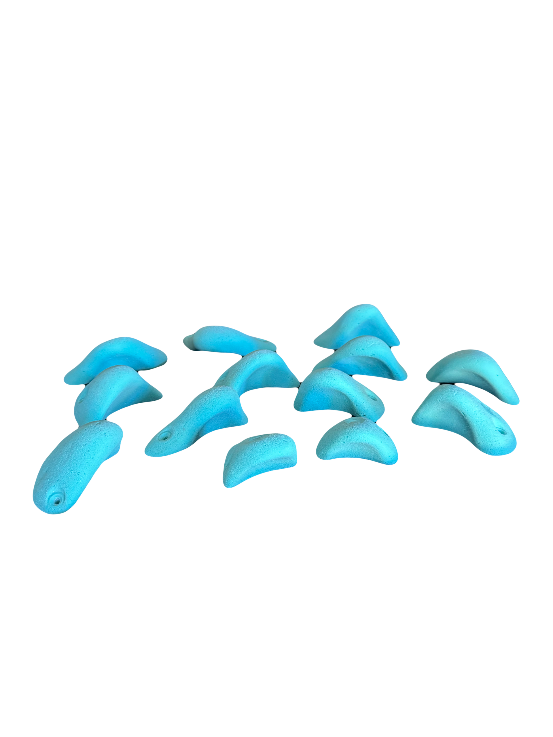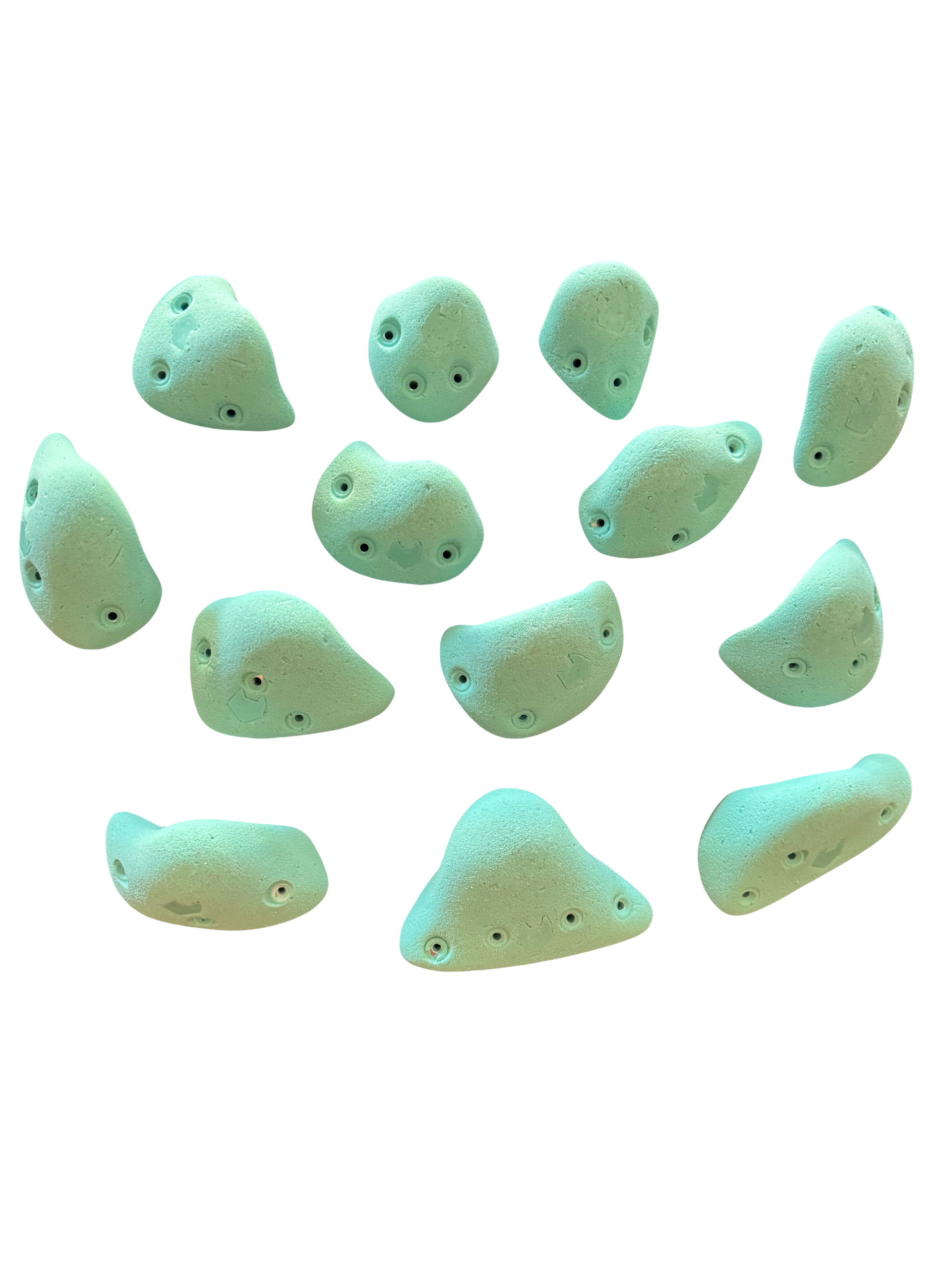 Pack de 13 presas de escalada. Todas las presas son buenas y de agarres profundos. Ideales para niñxs y principiantes. En tallas L y M.