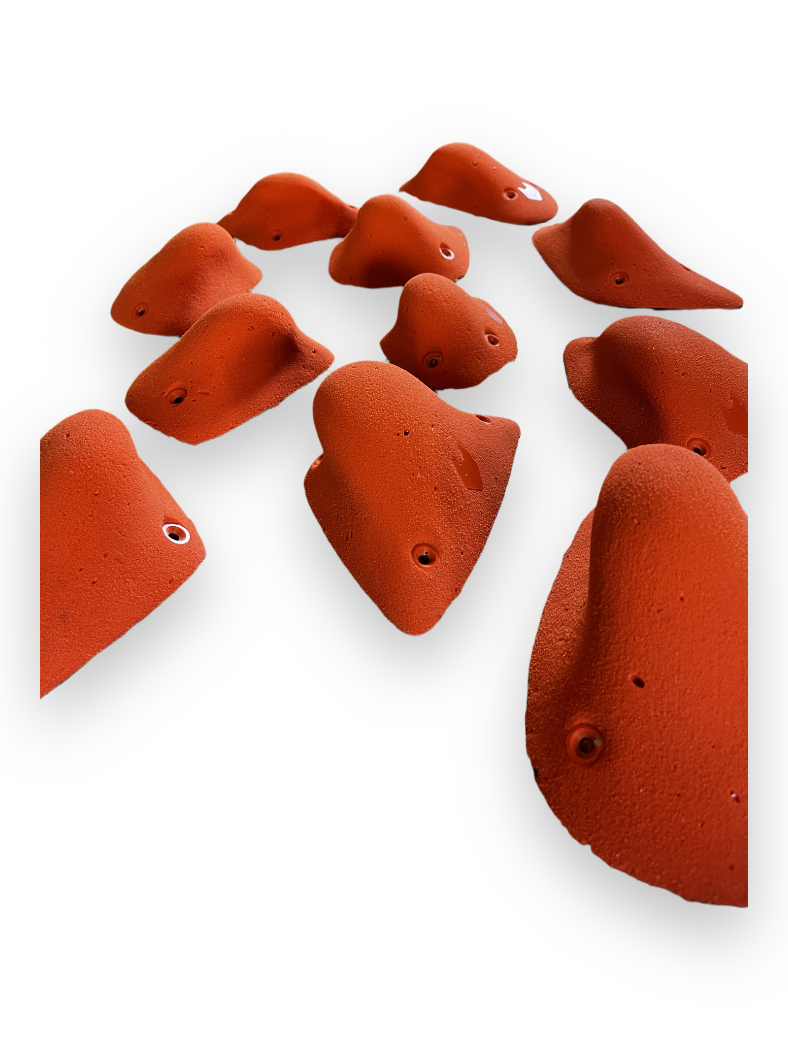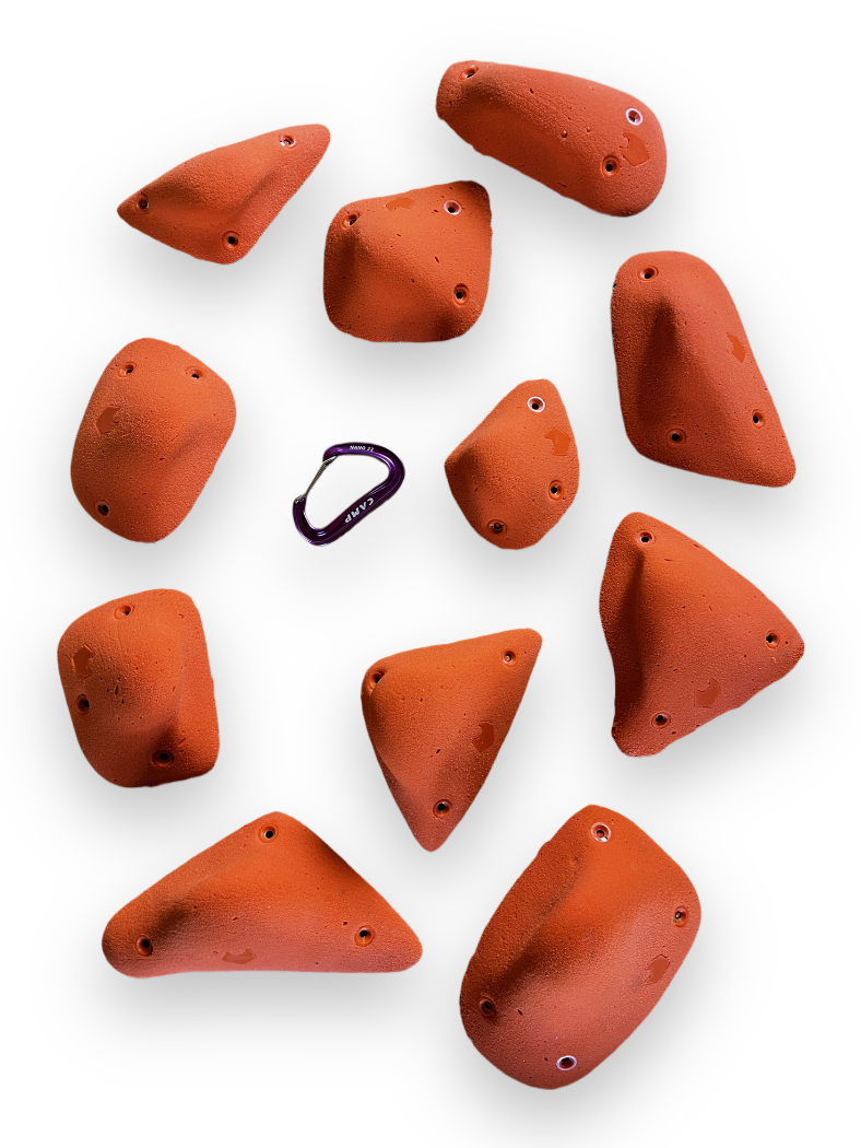 Set de 11 presas de escalada con buenos y malos agarres en todas sus tallas. Ideales para todo tipo de inclinación. Fijación por tornillos