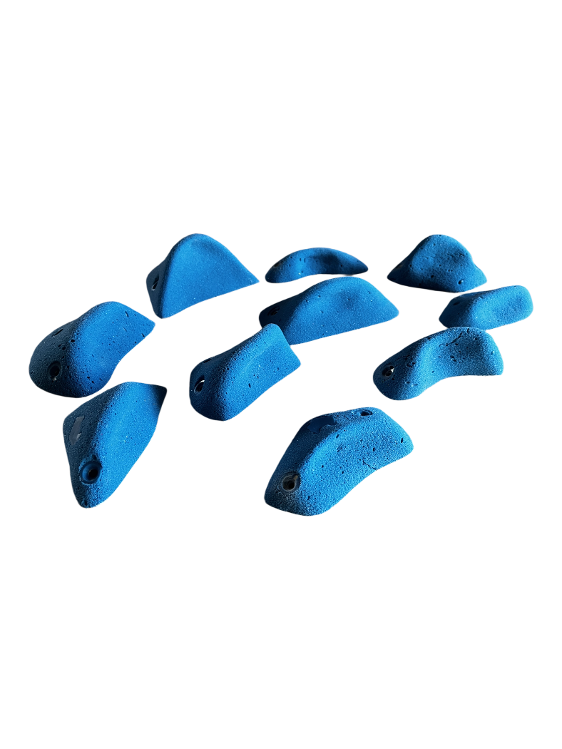 Set de 10 presas en tallas M y S. Desafiantes para desplomes de 25 grados hacia arriba.